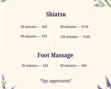 We uses gentle finger and palm pressure along the body’s energy pathways to restore balance, release tension, and promote deep relaxation. Rooted in traditional Japanese therapy, it helps improve circulation, relieve stress, and enhance overall well-being without using oils.