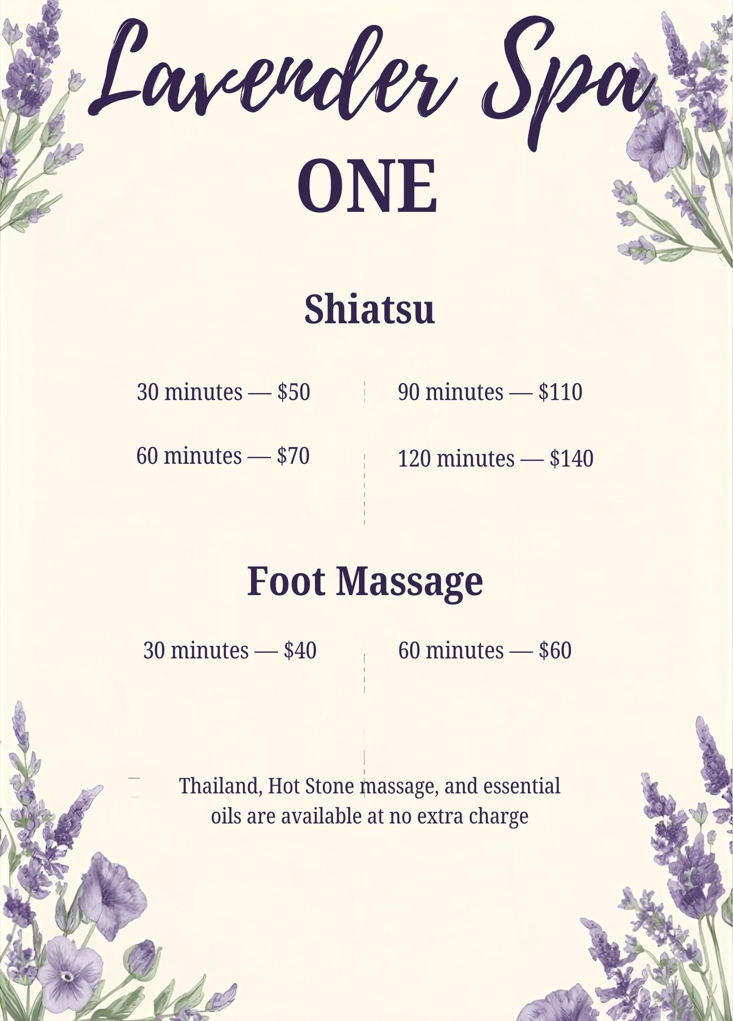 All body massages are available in 30-minute intervals from 30 to 180 minutes. Foot massages are offered in 30, 60, 90, and 120-minute sessions, starting at $40. Hot stone therapy and essential oils are included at no extra cost to enhance your relaxation.
